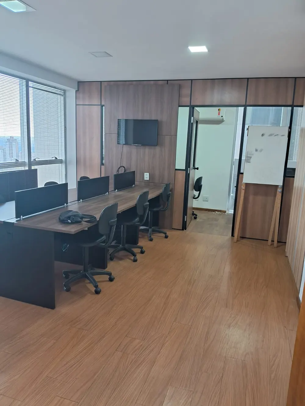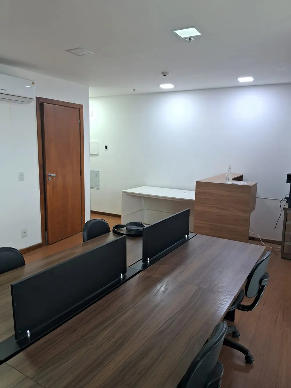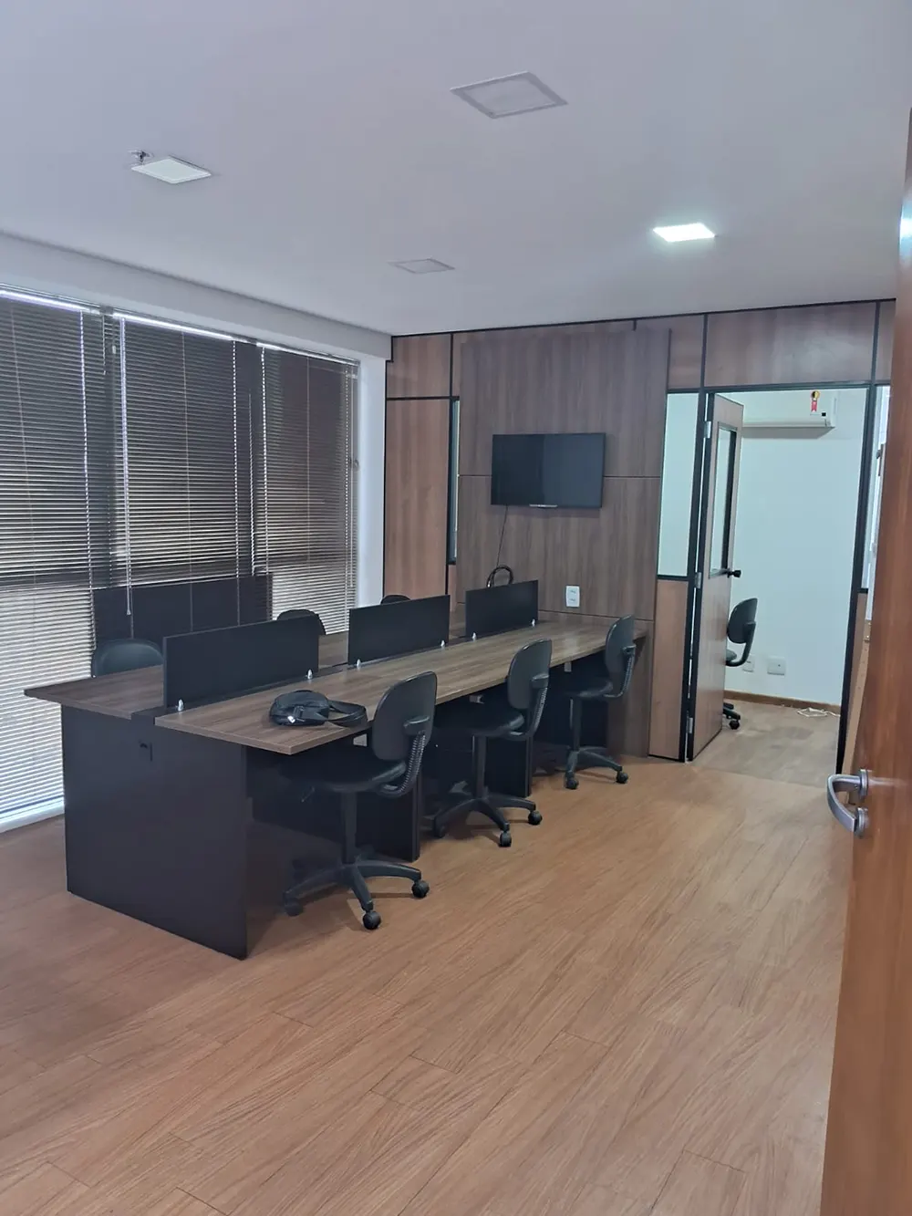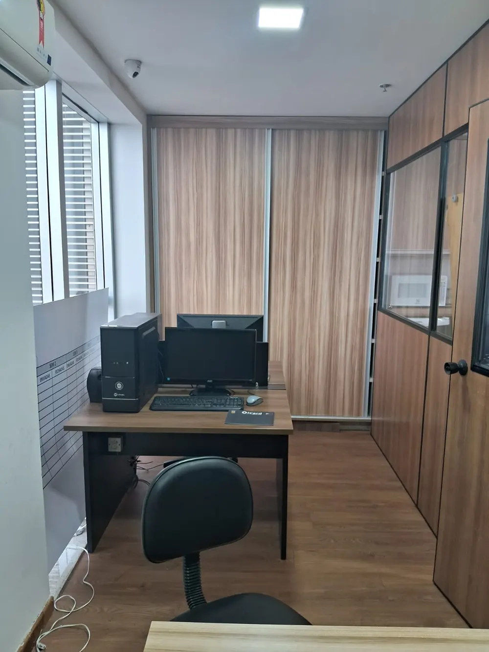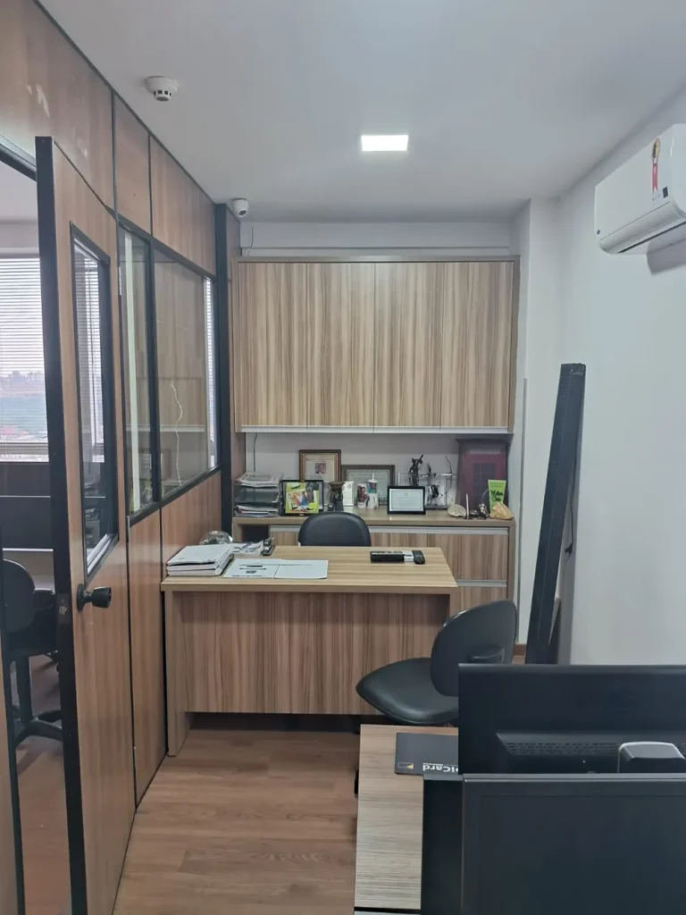 Sala rica em armários planejados, mesas e cadeiras para escritório, 2 ar condicionado e sistema de câmera.