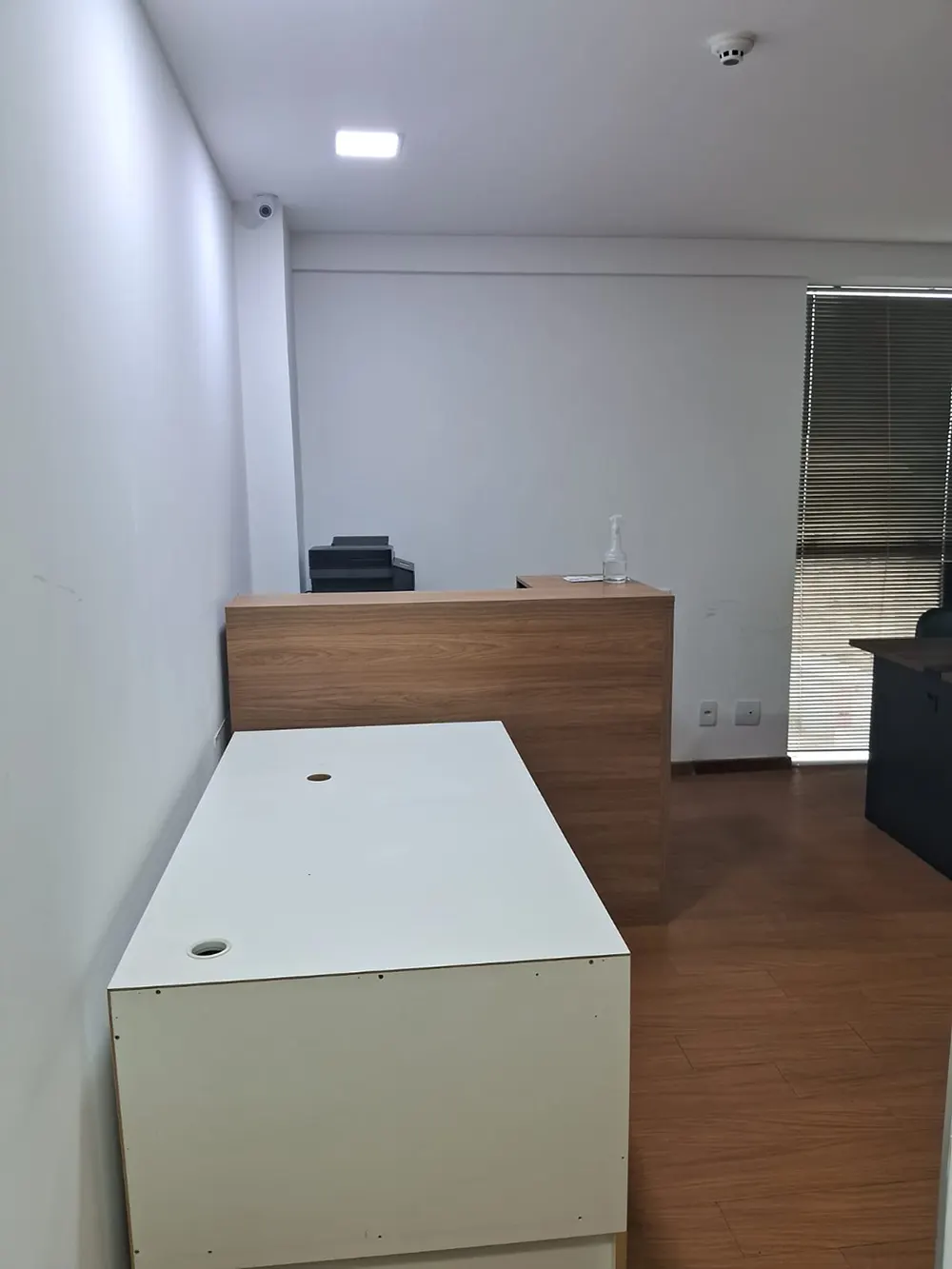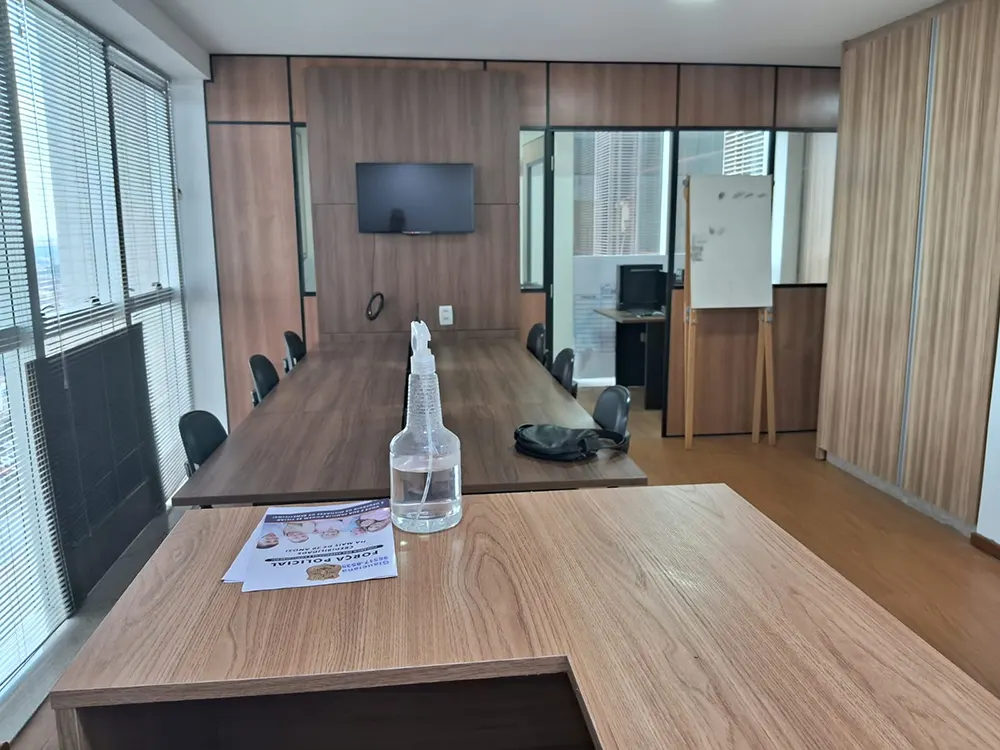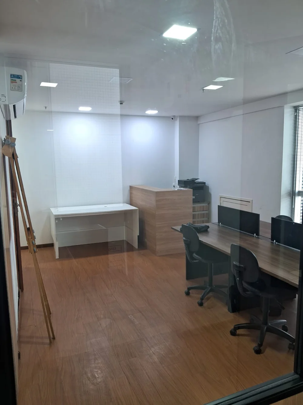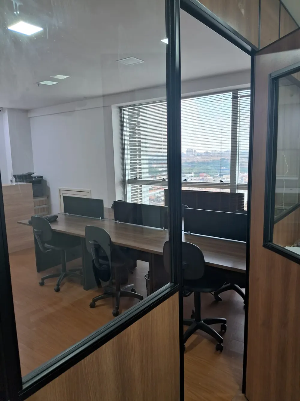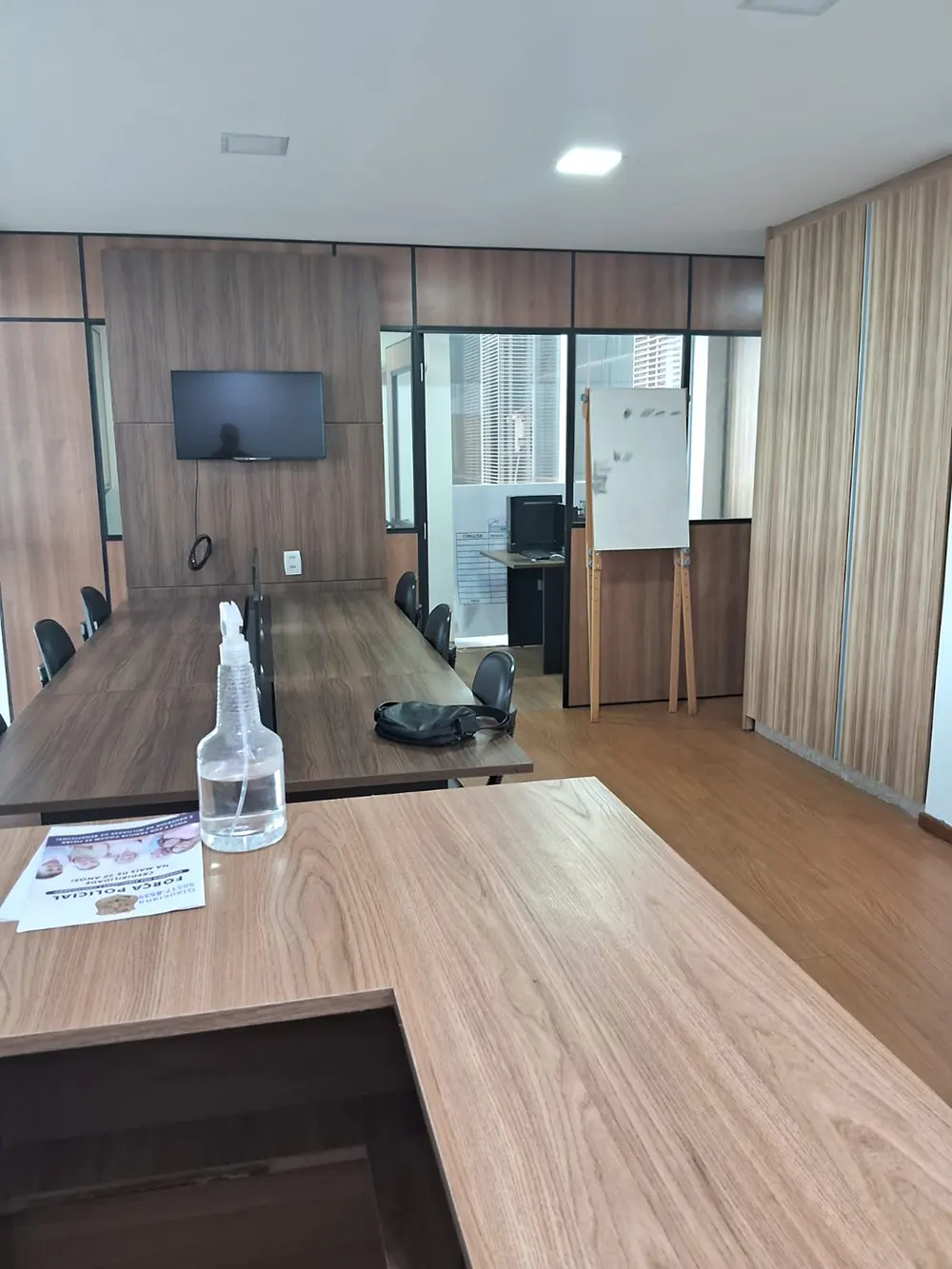Sala rica em armários planejados, mesas e cadeiras para escritório, 2 ar condicionado e sistema de câmera.