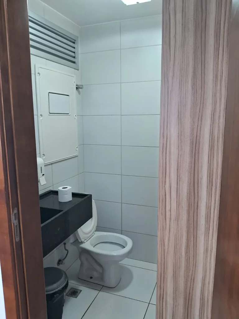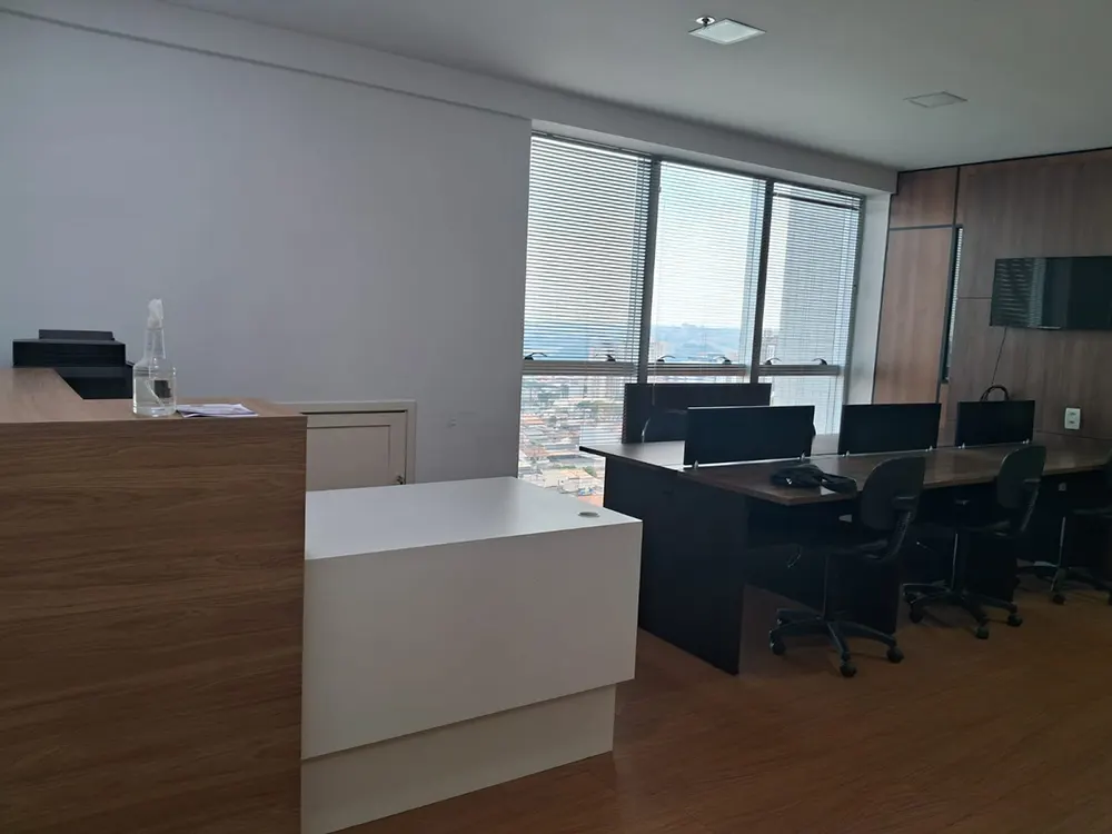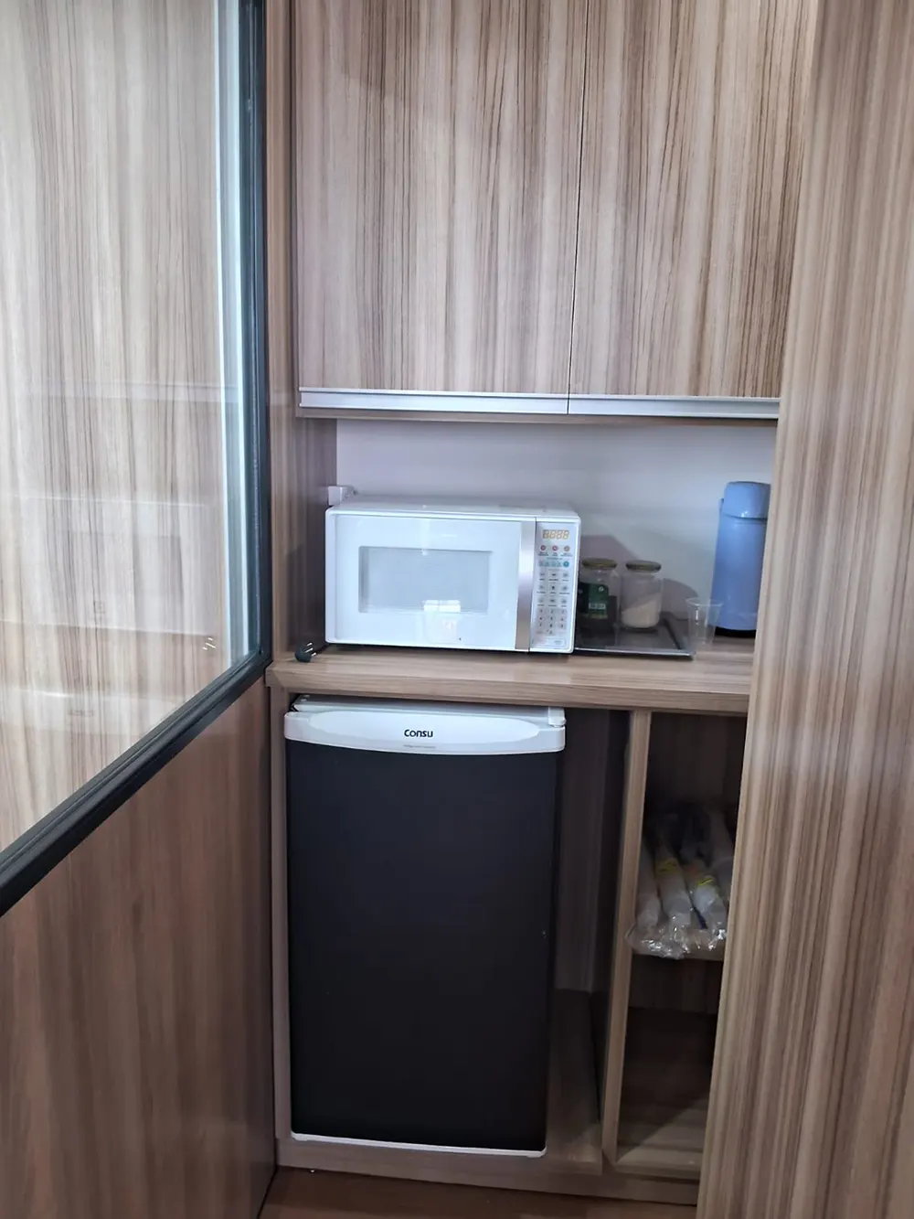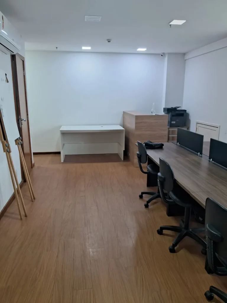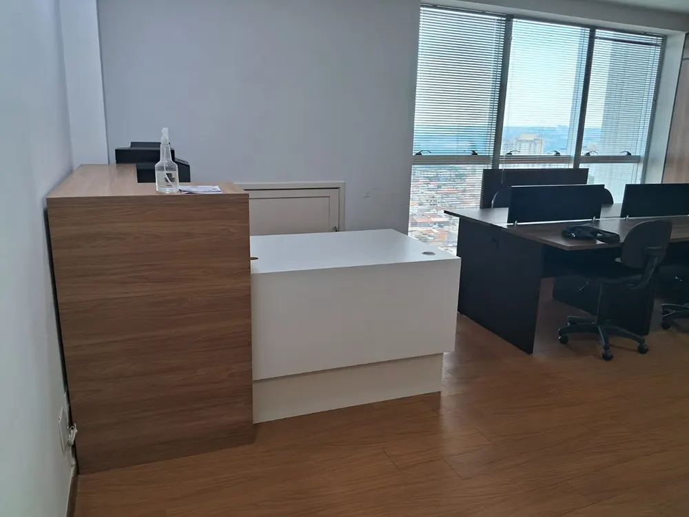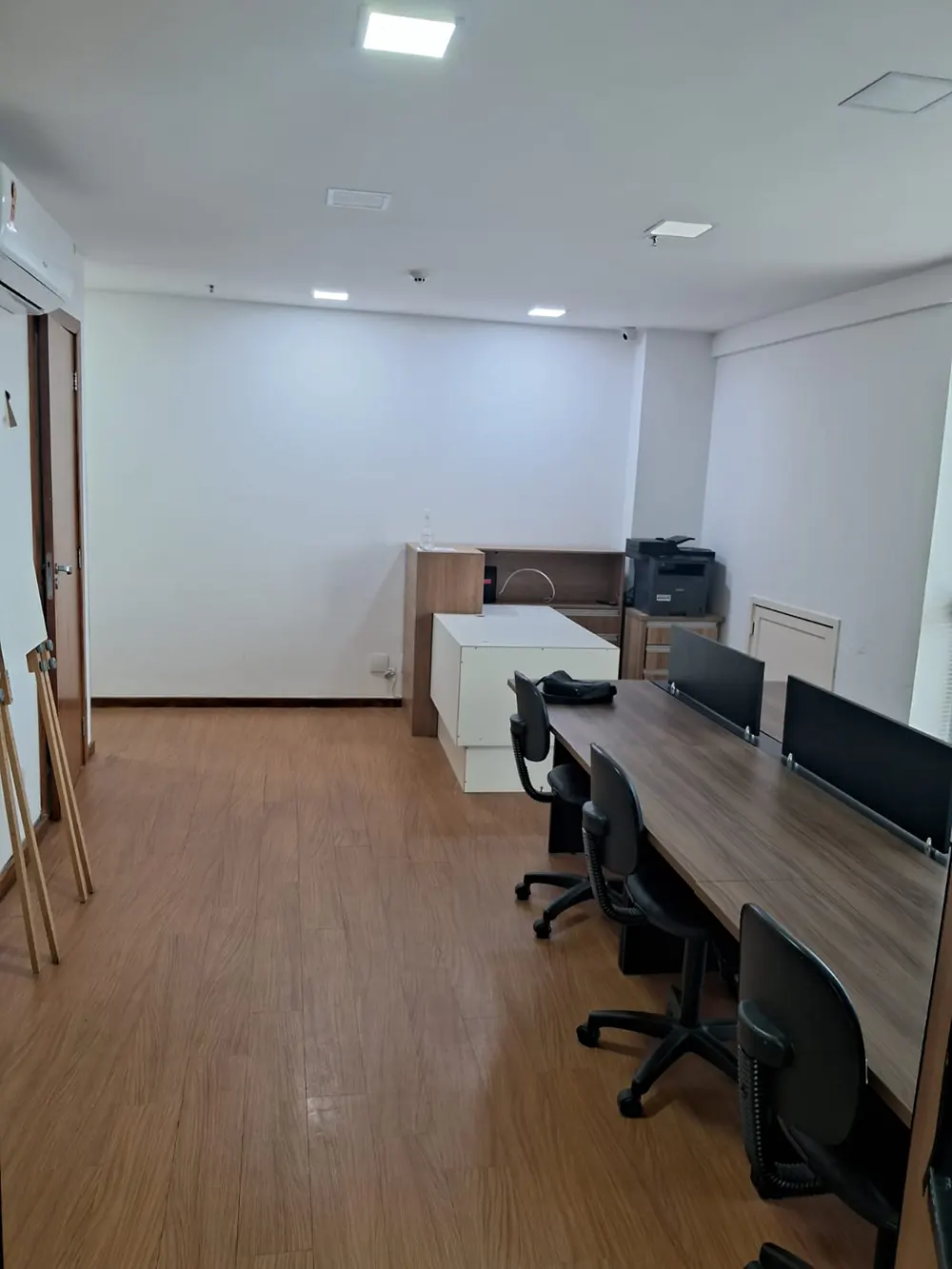 Sala rica em armários planejados, mesas e cadeiras para escritório, 2 ar condicionado e sistema de câmera.